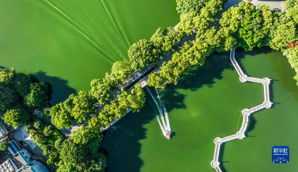 10月3日,游客乘船游覽廣西桂林市桂湖(無(wú)人機照片)。