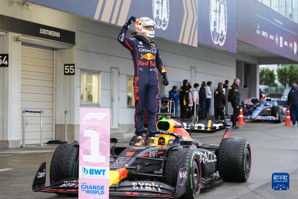 這是2022年10月9日,紅牛車(chē)隊荷蘭車(chē)手維斯塔潘慶祝獲得世界一級方程式賽車(chē)錦標賽(F1)日本大獎賽冠軍。