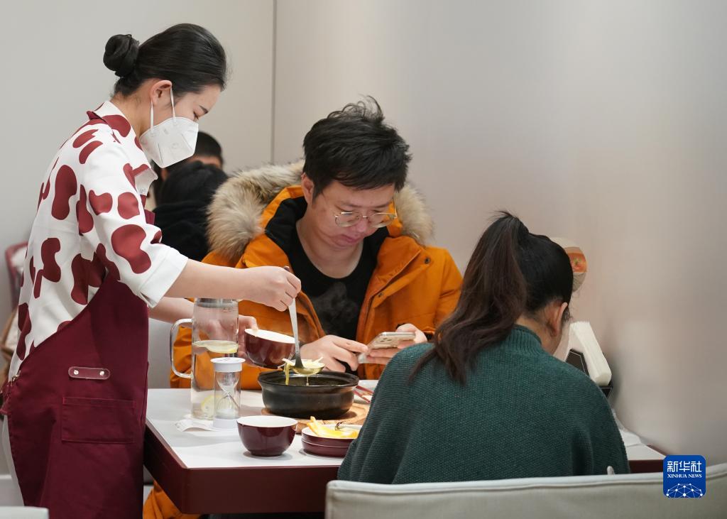 在北京世紀金源購物中心的一家餐廳,工作人員(左一)為顧客服務(wù)(12月25日攝)。