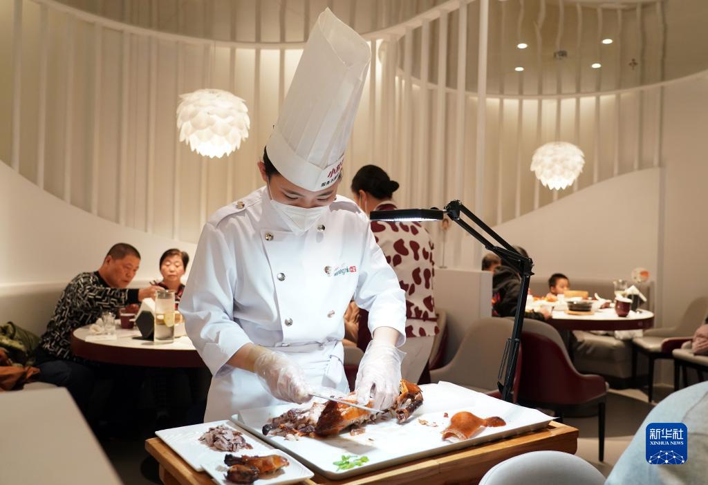 在北京世紀金源購物中心的一家餐廳,工作人員為顧客片烤鴨(12月25日攝)。