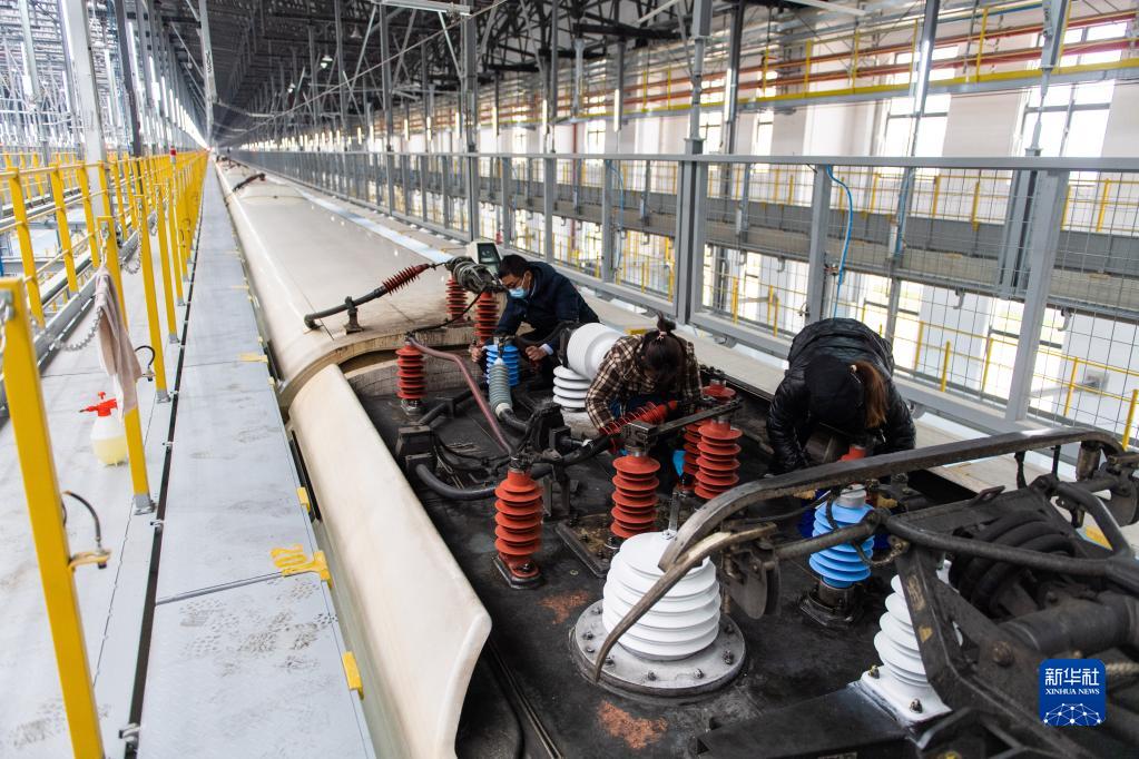 12月26日,工作人員在渝廈高鐵長(cháng)沙西動(dòng)車(chē)運用所6線(xiàn)檢查庫對停放的列車(chē)進(jìn)行保養。