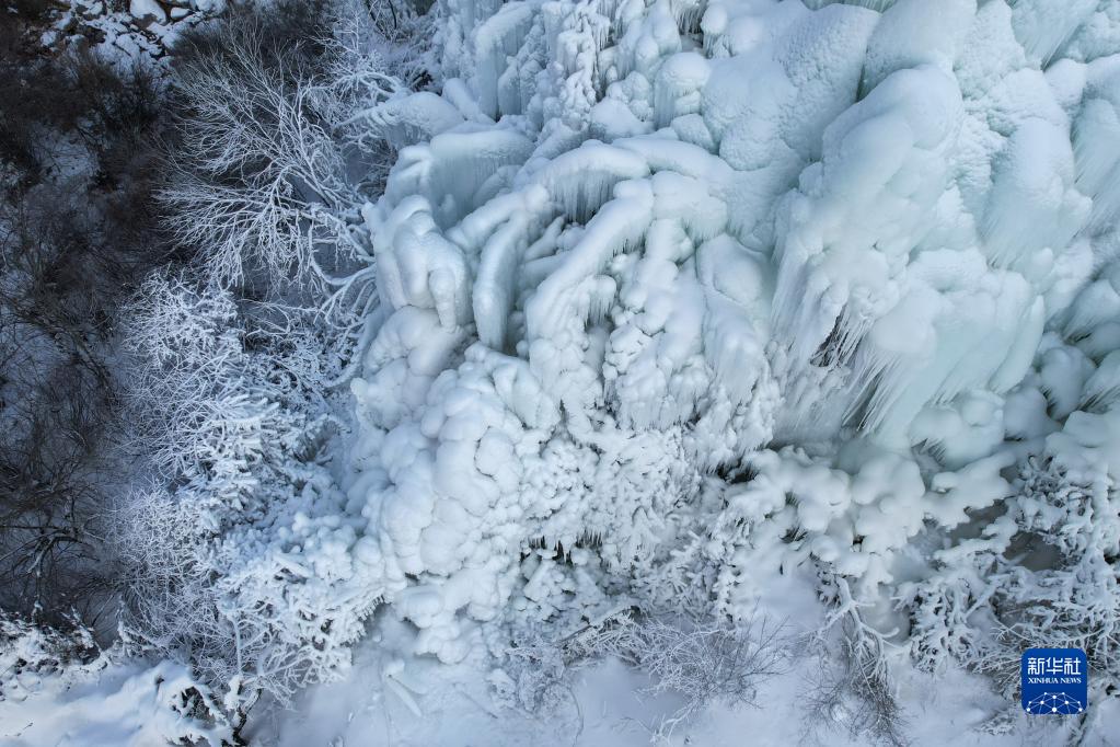 這是12月26日在甘肅省渭源縣天井峽(渭河東源)景區拍攝的冰瀑景觀(guān)(無(wú)人機照片)。
