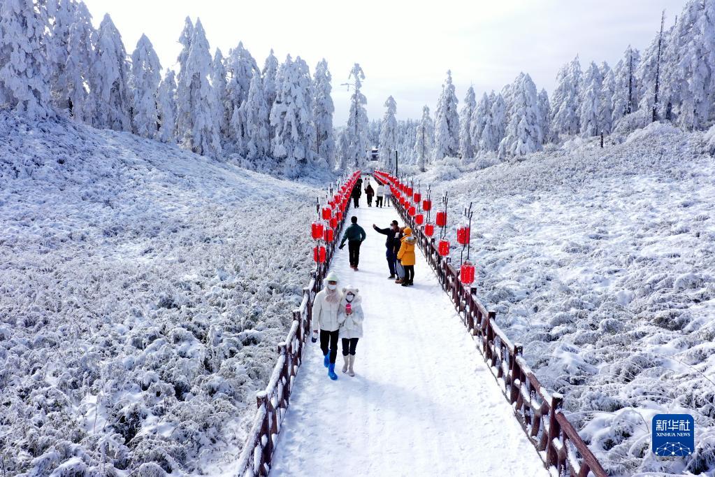 游客在四川省眉山市洪雅縣瓦屋山游玩賞雪(2022年12月18日攝,無(wú)人機照片)。