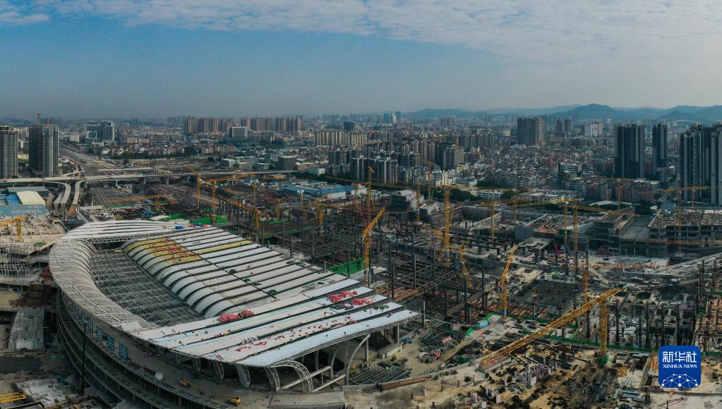 廣州白云火車(chē)站項目一期金屬屋面和二期主體結構建設現場(chǎng)(無(wú)人機照片,12月27日攝)。