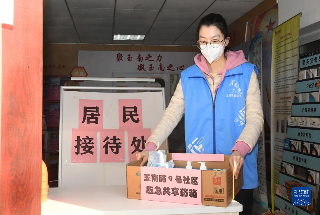 12月27日,在北京市海淀區羊坊店街道玉南路9號社區居委會(huì ),工作人員將“共享藥箱”放置在門(mén)口。