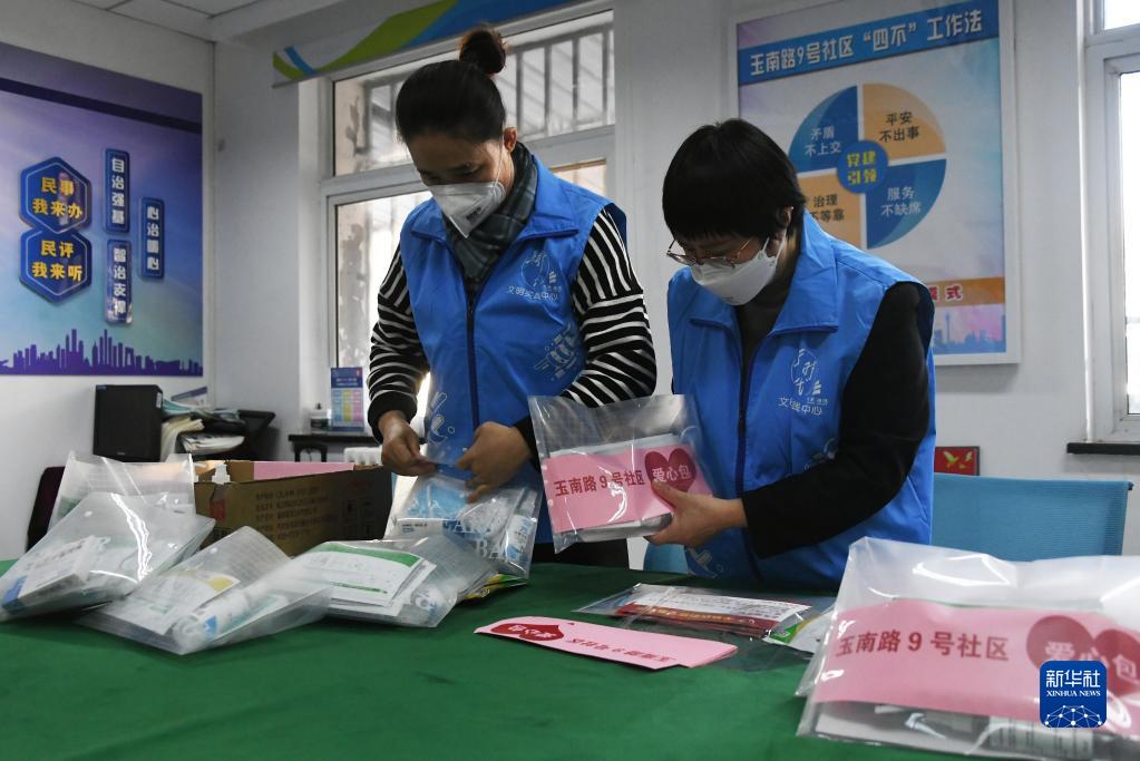 12月27日,在北京市海淀區羊坊店街道玉南路9號社區居委會(huì ),社區工作人員在裝“防疫愛(ài)心包”。