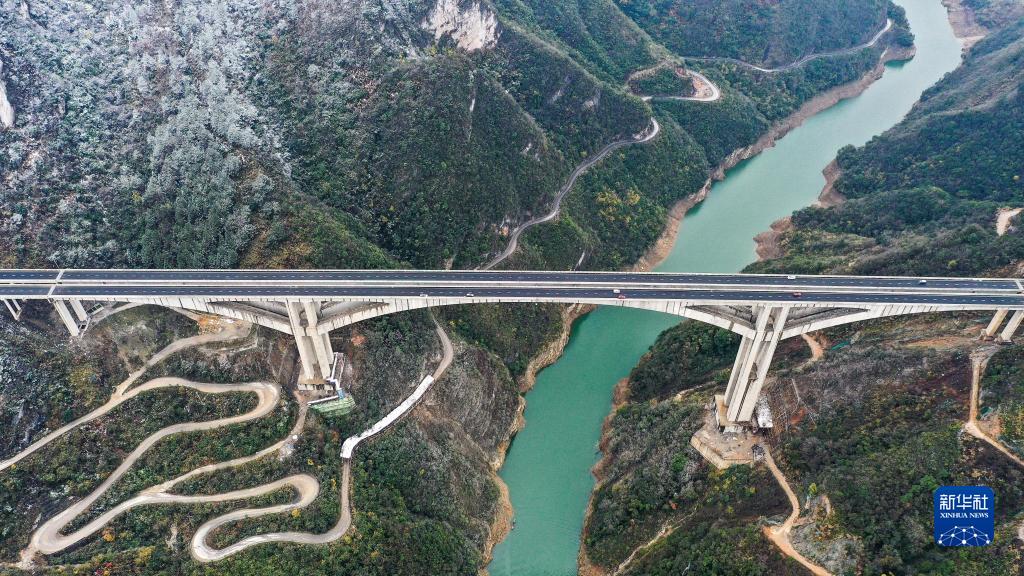 12月28日,車(chē)輛從貴陽(yáng)至黃平高速公路貴定互通連接線(xiàn)甘溪特大橋上通過(guò)(無(wú)人機照片)。