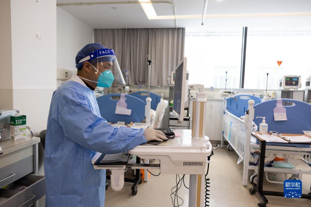 12月27日,在上海交通大學(xué)醫學(xué)院附屬新華醫院兒童急診ICU陽(yáng)性病區,醫生在輸入病例信息。