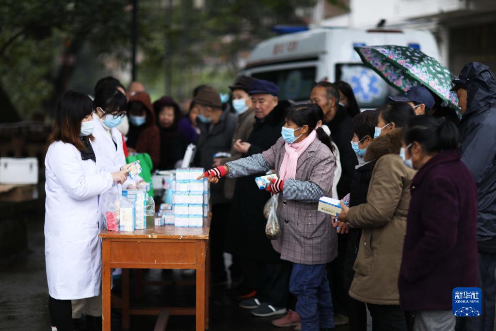 12月28日,在赤水市石堡鄉朝陽(yáng)社區,醫護人員為群眾發(fā)放藥品。