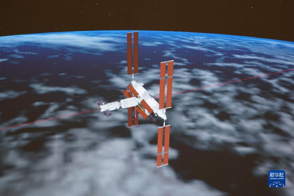 11月12日在北京航天飛行控制中心拍攝的天舟五號貨運飛船與空間站組合體完成自主快速交會(huì )對接示意圖。北京時(shí)間2022年11月12日12時(shí)10分,天舟五號貨運飛船入軌后順利完成狀態(tài)設置,采取自主快速交會(huì )對接模式,成功對接于空間站天和核心艙后向端口,中國航天員首次在空間站迎接貨運飛船來(lái)訪(fǎng)?!⌒氯A社發(fā)(孫豐曉 攝)