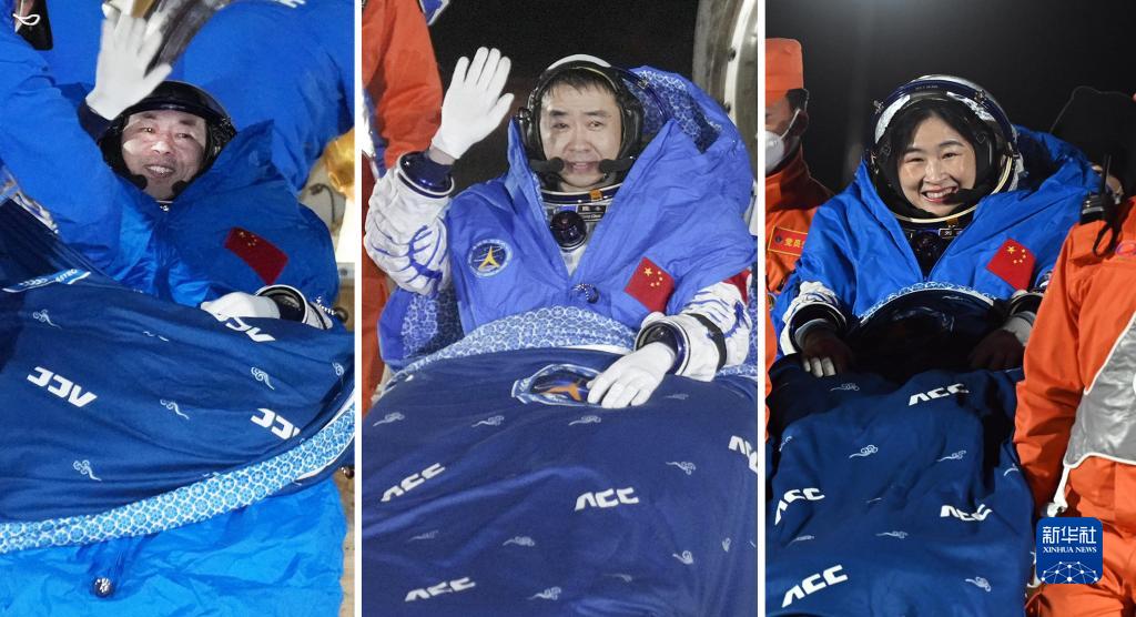 12月4日,神舟十四號載人飛船返回艙在東風(fēng)著(zhù)陸場(chǎng)成功著(zhù)陸。這是航天員陳冬(中)、劉洋(右)、蔡旭哲安全順利出艙(拼版照片)?!⌒氯A社發(fā)