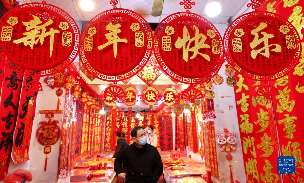 12月29日,在山東省棗莊市一處年貨市場(chǎng)內,人們選購新年飾品。