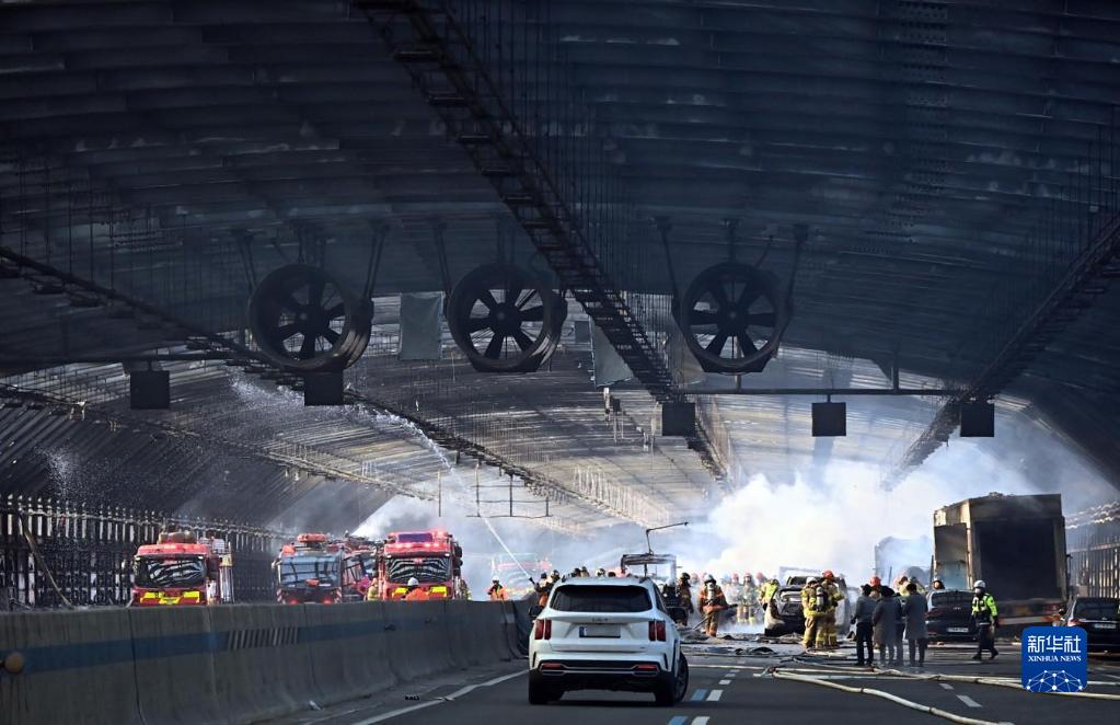 12月29日,消防人員在韓國京畿道果川第二京仁高速公路發(fā)生火災的隔音隧道內工作。
