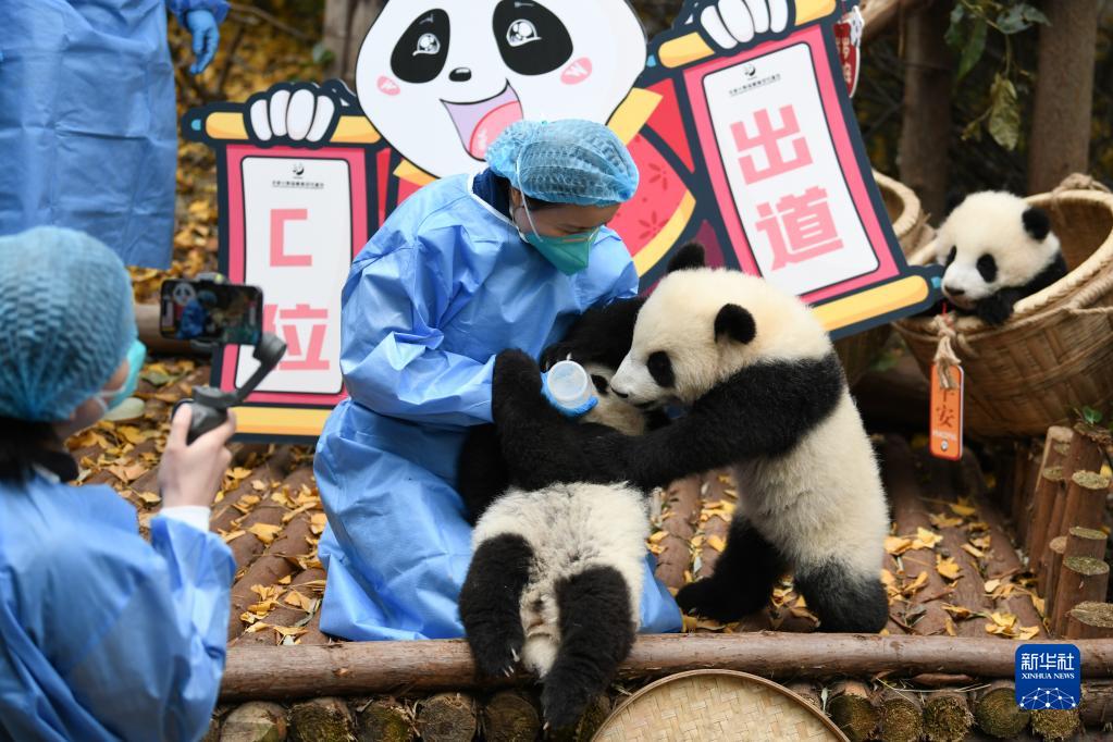 元旦將至,成都大熊貓繁育研究基地內13只2022年新生大熊貓寶寶集體亮相,為游客們送上新年祝福。