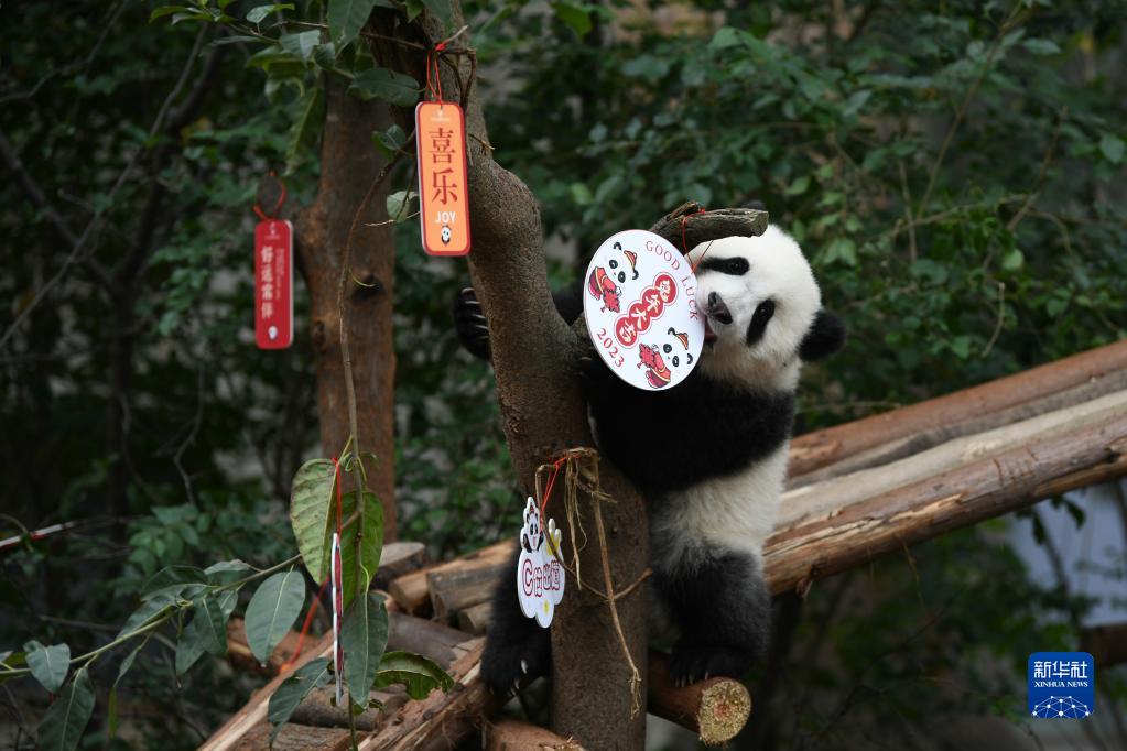 元旦將至,成都大熊貓繁育研究基地內13只2022年新生大熊貓寶寶集體亮相,為游客們送上新年祝福。