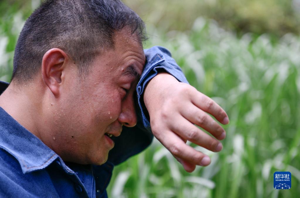 劉開(kāi)福收割投喂螞蚱所需的草料時(shí)擦拭汗水(2022年8月3日攝)。
