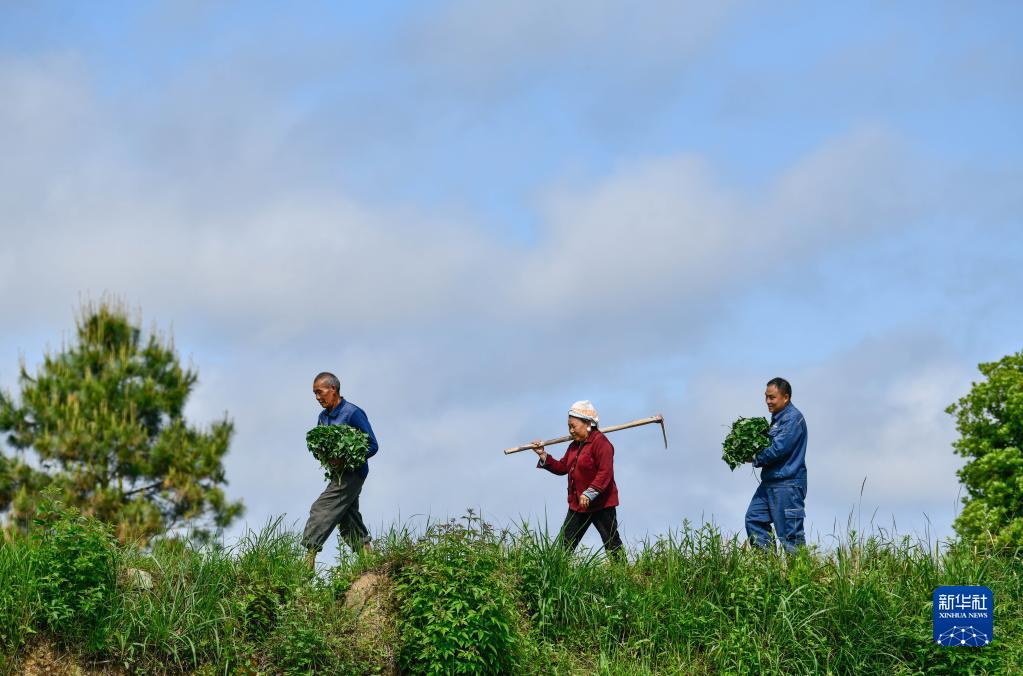 劉開(kāi)福(右)與村民搬運即將移栽的紫薯苗(2022年5月10日攝)。