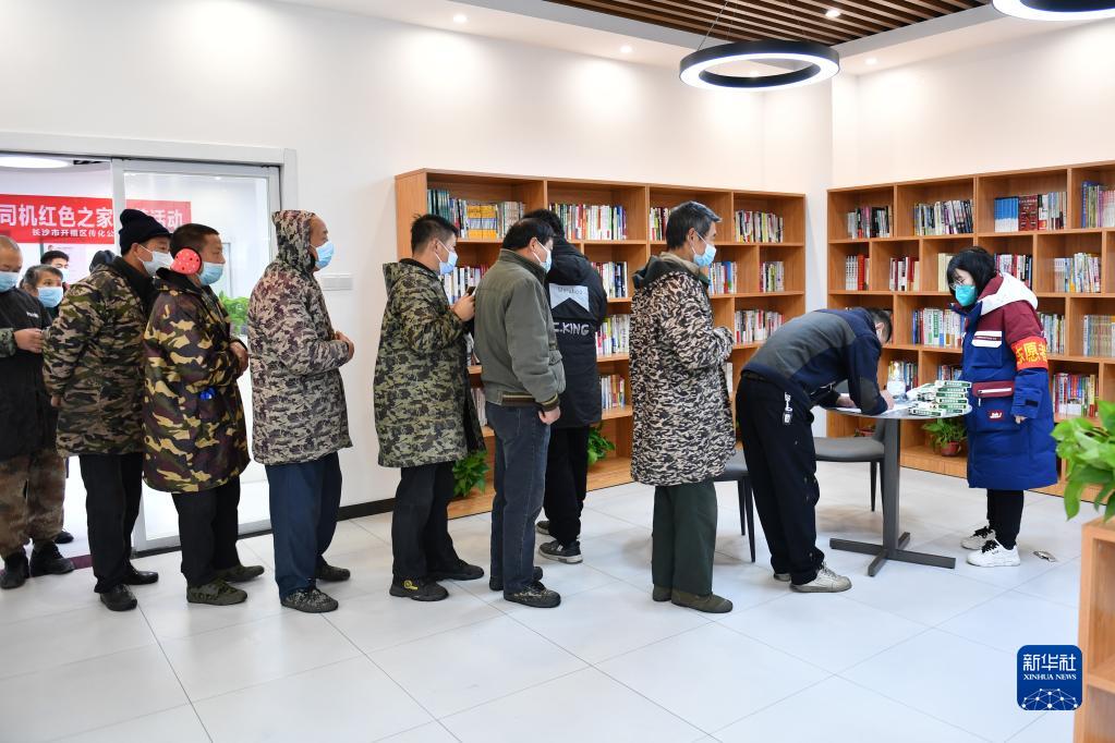 12月29日,在長(cháng)沙市開(kāi)福區傳化公路港物流園區的“紅色之家”,司機們排隊領(lǐng)取藥品。