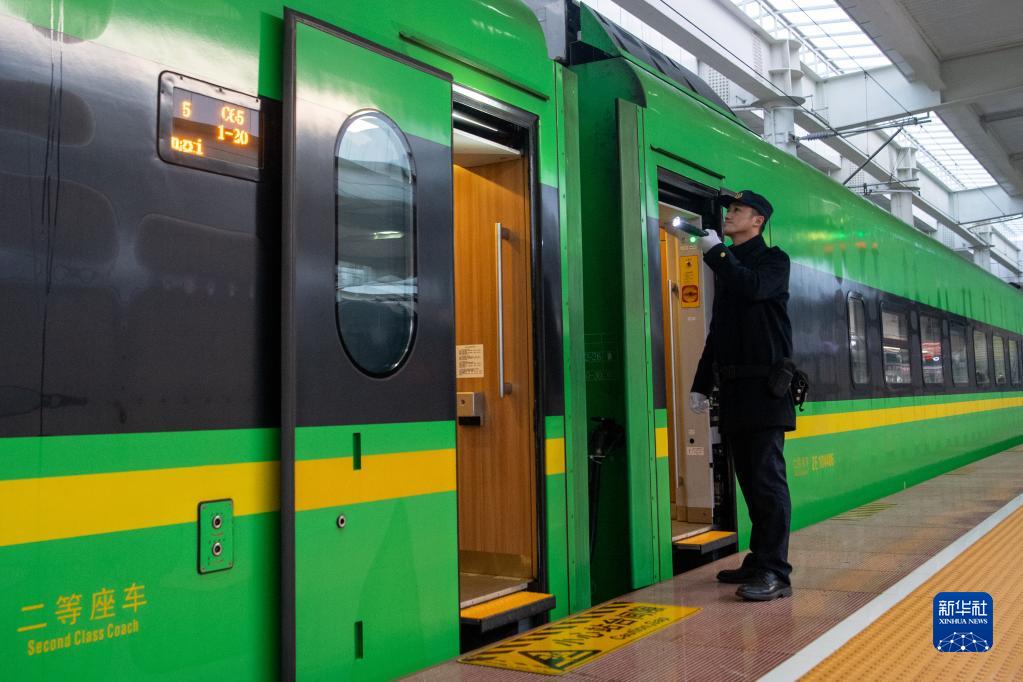 12月30日,鐵路工作人員在首趟重慶東環(huán)鐵路列車(chē)外進(jìn)行巡查工作。
