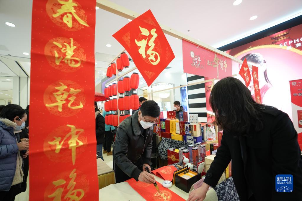 12月30日,在北京年貨節啟動(dòng)活動(dòng)的年貨市集區,工作人員在現場(chǎng)書(shū)寫(xiě)春聯(lián)。