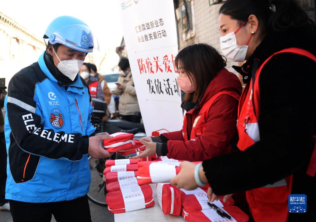 12月30日,在北京市西城區新街口街道一外賣(mài)騎手站點(diǎn),中國紅十字基金會(huì )工作人員為外賣(mài)騎手送上“防疫關(guān)愛(ài)包”。新華社記者 劉勇貞 攝