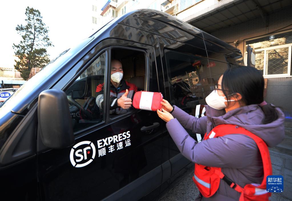12月30日,在北京順豐速運有限公司大方家業(yè)務(wù)部,中國紅十字基金會(huì )工作人員為快遞人員送上“防疫關(guān)愛(ài)包”。新華社記者 劉勇貞 攝