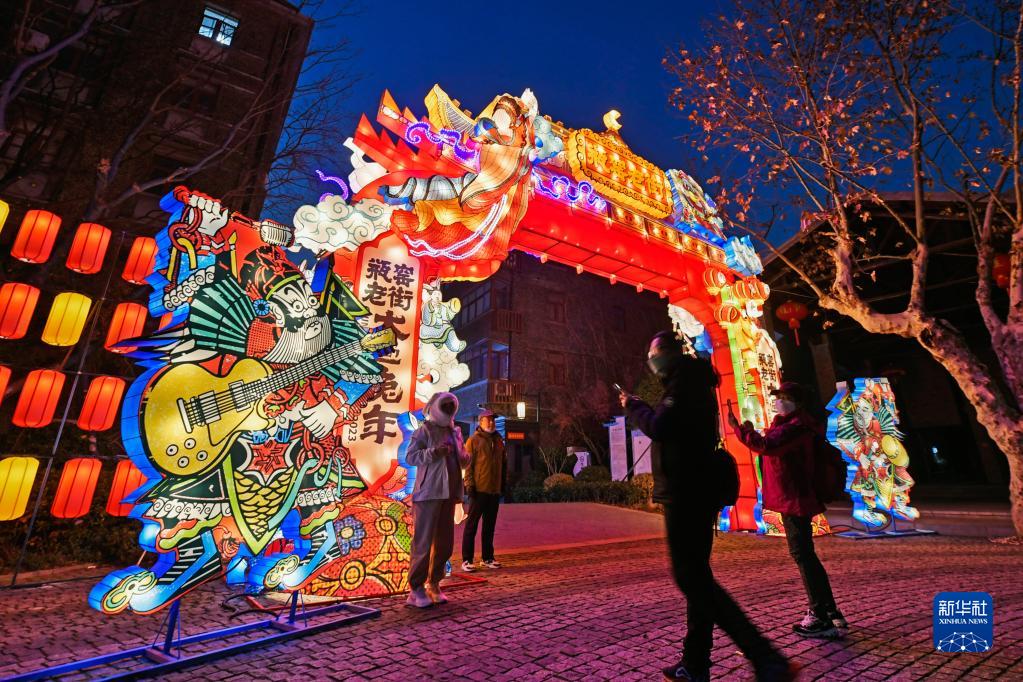 12月30日,游客在瓶窯老街燈會(huì )上展示的巨型花燈前合影。