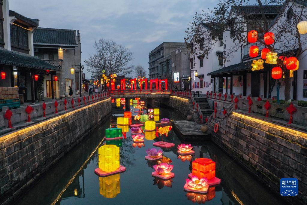 12月30日,瓶窯老街的河道水面上放置了各式花燈(無(wú)人機照片)。