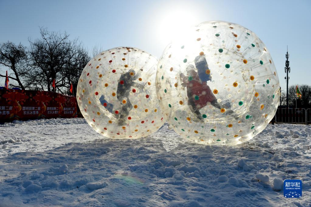 12月31日,游客在圓明園雪場(chǎng)體驗雪地悠波球。