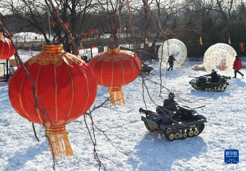 12月31日,游客在圓明園雪場(chǎng)玩“雪地坦克”。