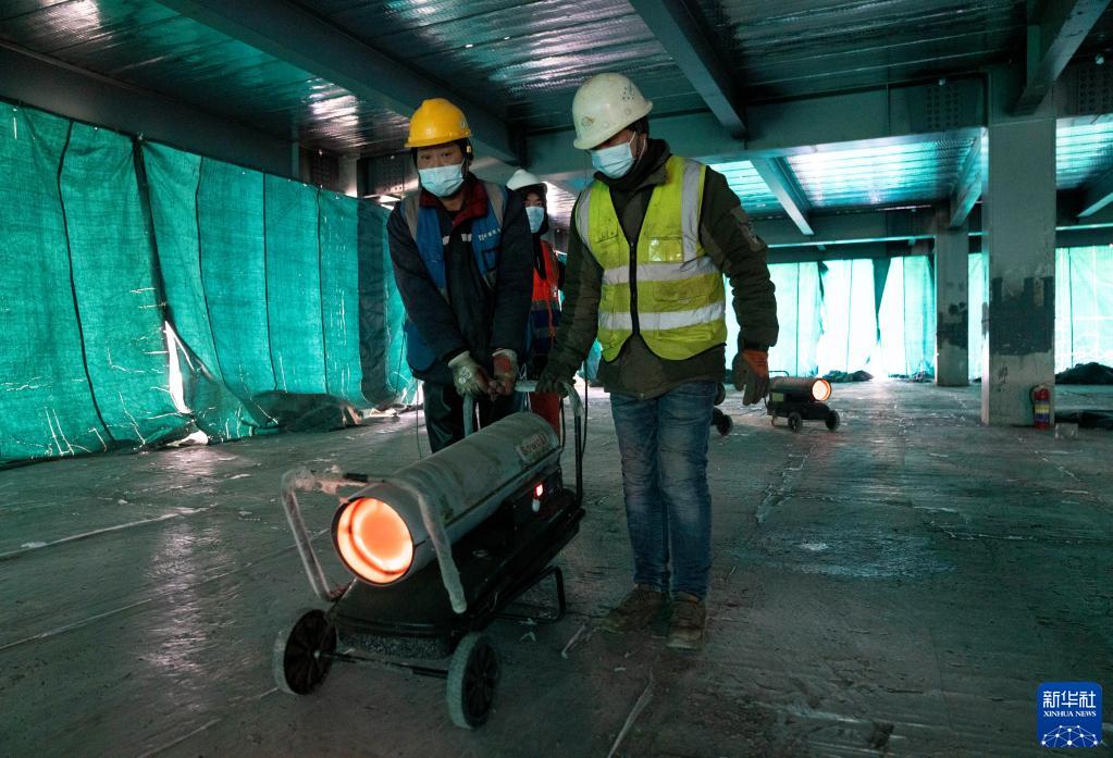 12月31日,在北京市豐臺區檔案館建設項目工地,工人們使用暖風(fēng)機為新澆筑的混凝土樓板升溫。