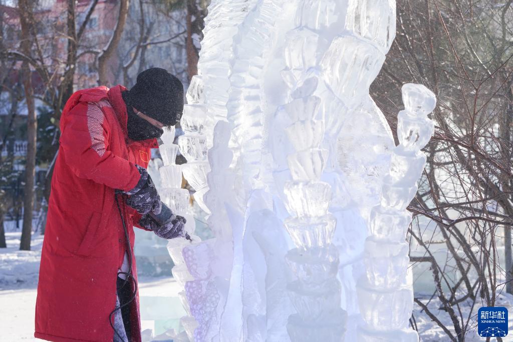 12月31日拍攝的獲得設計類(lèi)金獎的冰雕作品《相約》。