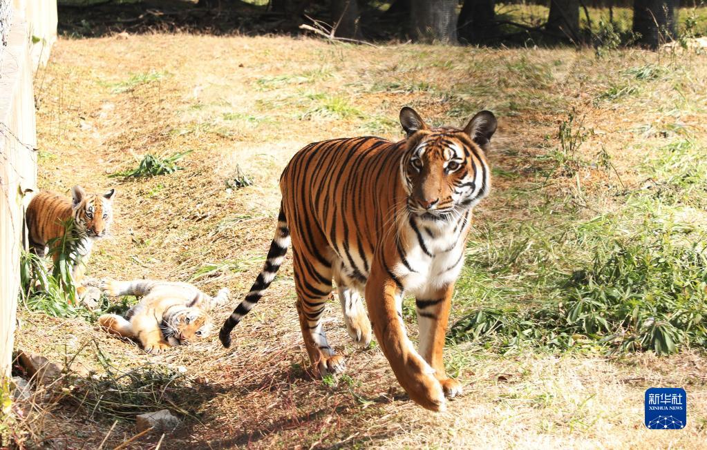 當日,中國華南虎蘇州培育基地出生不足百天的雙胞胎小華南虎亮相。這兩只小華南虎出生于2022年10月,目前生長(cháng)情況良好。