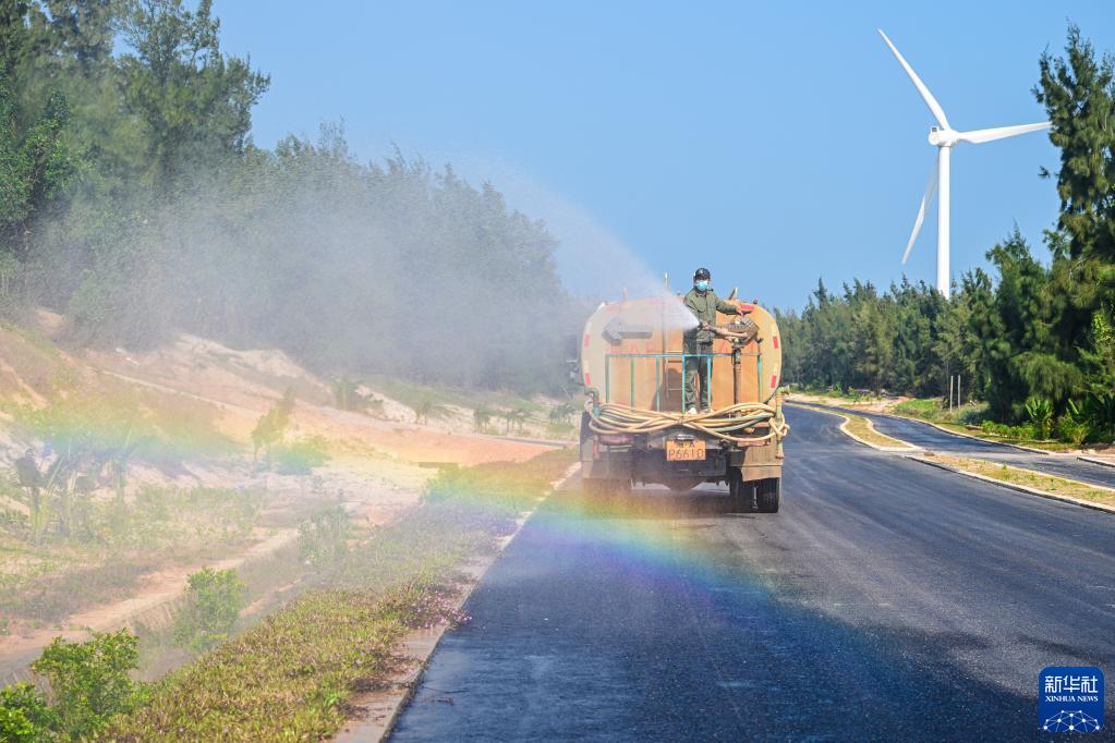 12月30日,工人在海南環(huán)島旅游公路文昌木蘭灣段為新種的草皮、灌木澆水。