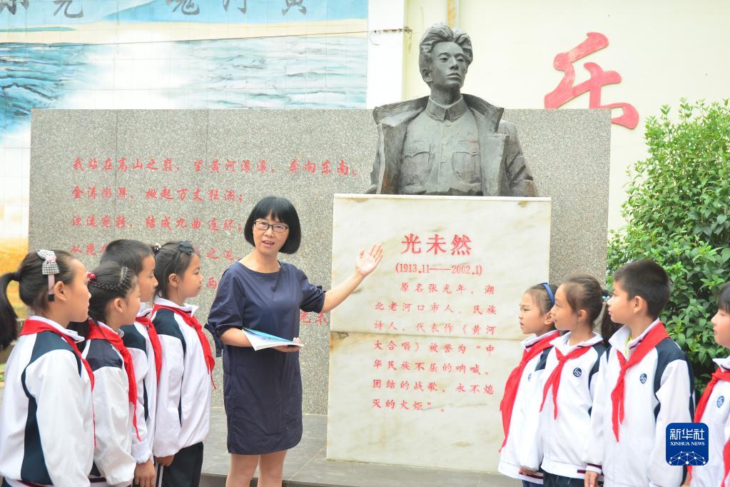 湖北省老河口市光未然小學(xué)創(chuàng )辦于1921年,2008年5月,由原老河口市第三小學(xué)更名為光未然小學(xué)。該小學(xué)依托得天獨厚的文化底色,把光未然的家國情懷、文學(xué)影響力和《黃河大合唱》所體現的民族精神與立德樹(shù)人有機結合,打造“一館三區”紅色文化校園,使“承詩(shī)人大志,育愛(ài)國情懷”的辦學(xué)理念落小落實(shí)。新華社發(fā)