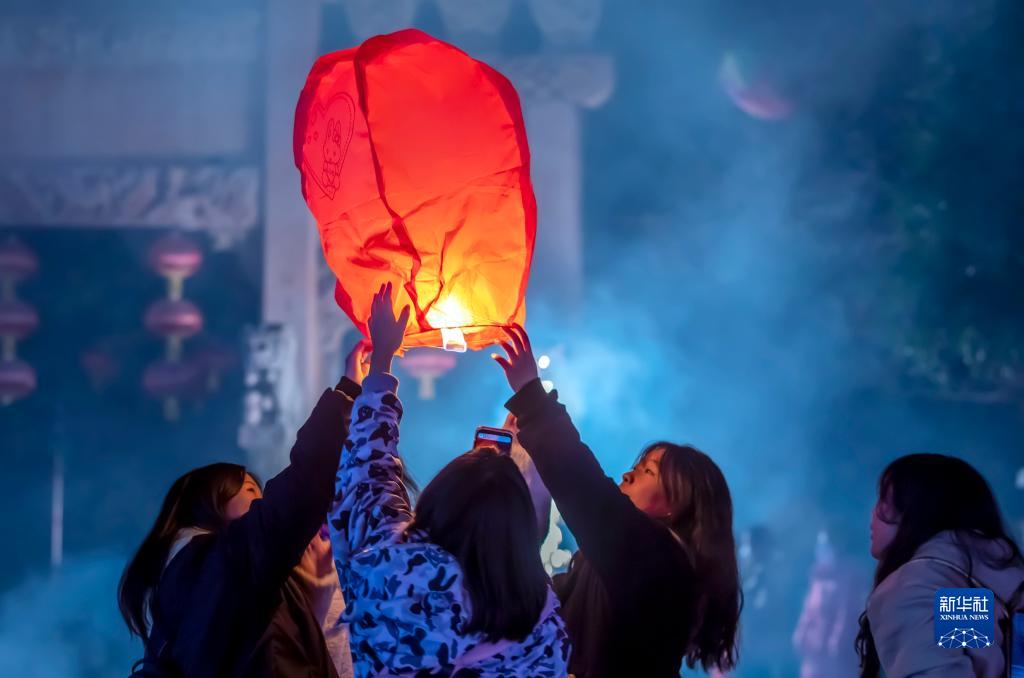 1月1日,群眾在貴州省黔西市水西公園放飛孔明燈寄托新年的祝福。