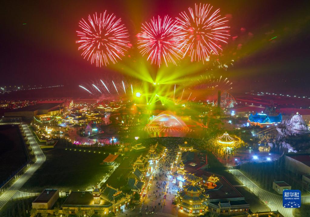 2022年12月31日,在江蘇省淮安市西游樂(lè )園,游客觀(guān)賞跨年煙花燈光秀(無(wú)人機照片)。