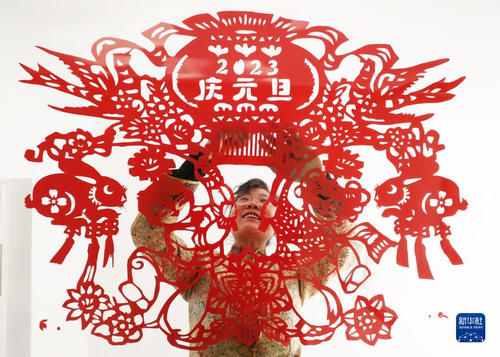 1月1日,河北省唐山市豐潤區剪紙藝人葛英在創(chuàng )作剪紙作品。