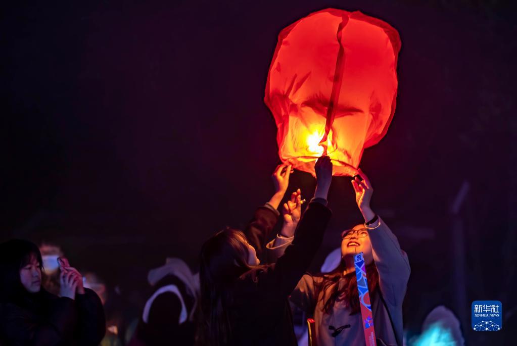 1月1日,群眾在貴州省黔西市水西公園放飛孔明燈寄托新年的祝福。