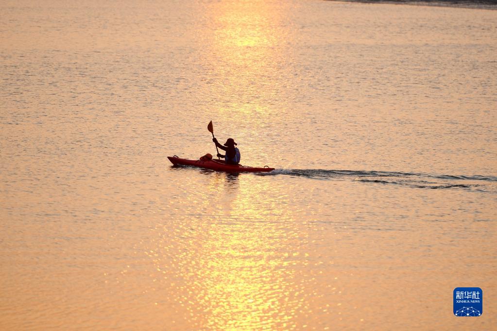 1月1日,在山東青島西海岸新區唐島灣公園,皮劃艇愛(ài)好者在海面上劃行。