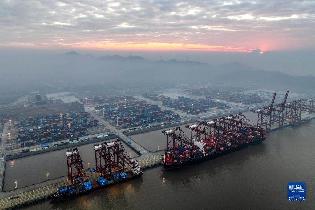 1月1日清晨,集裝箱輪在寧波舟山港金塘港區大浦口集裝箱碼頭進(jìn)行裝卸作業(yè)(無(wú)人機照片)。