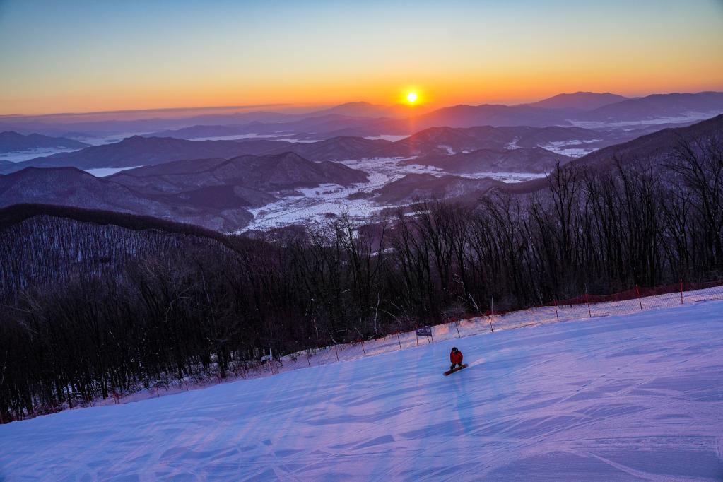 1月1日,在吉林省吉林市萬(wàn)科松花湖度假區,滑雪愛(ài)好者在清晨第一縷陽(yáng)光下滑雪。