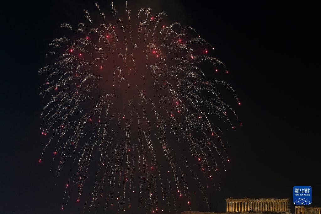 這是2023年1月1日在希臘雅典衛城拍攝的新年煙花。