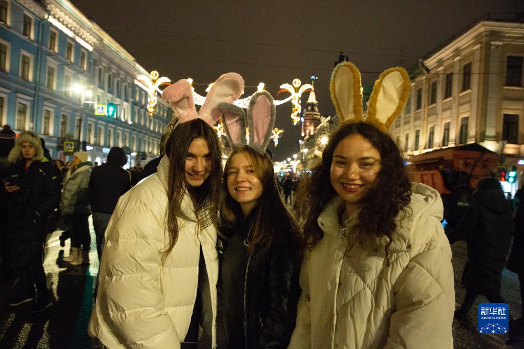 2022年12月31日,人們在俄羅斯圣彼得堡街頭迎接新年到來(lái)。
