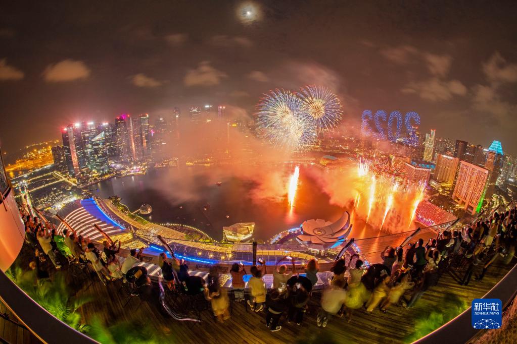 2023年1月1日,人們在新加坡濱海灣觀(guān)賞新年煙花與無(wú)人機燈光秀表演。