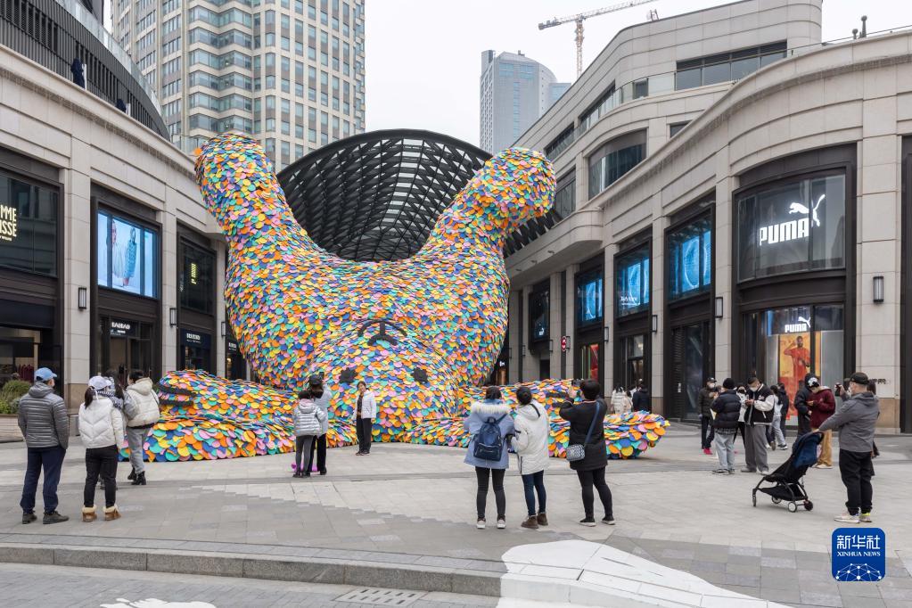 1月1日,市民在上海市靜安區南京西路興業(yè)太古匯門(mén)口的大型藝術(shù)裝置“五彩倒立兔”前拍照留影。