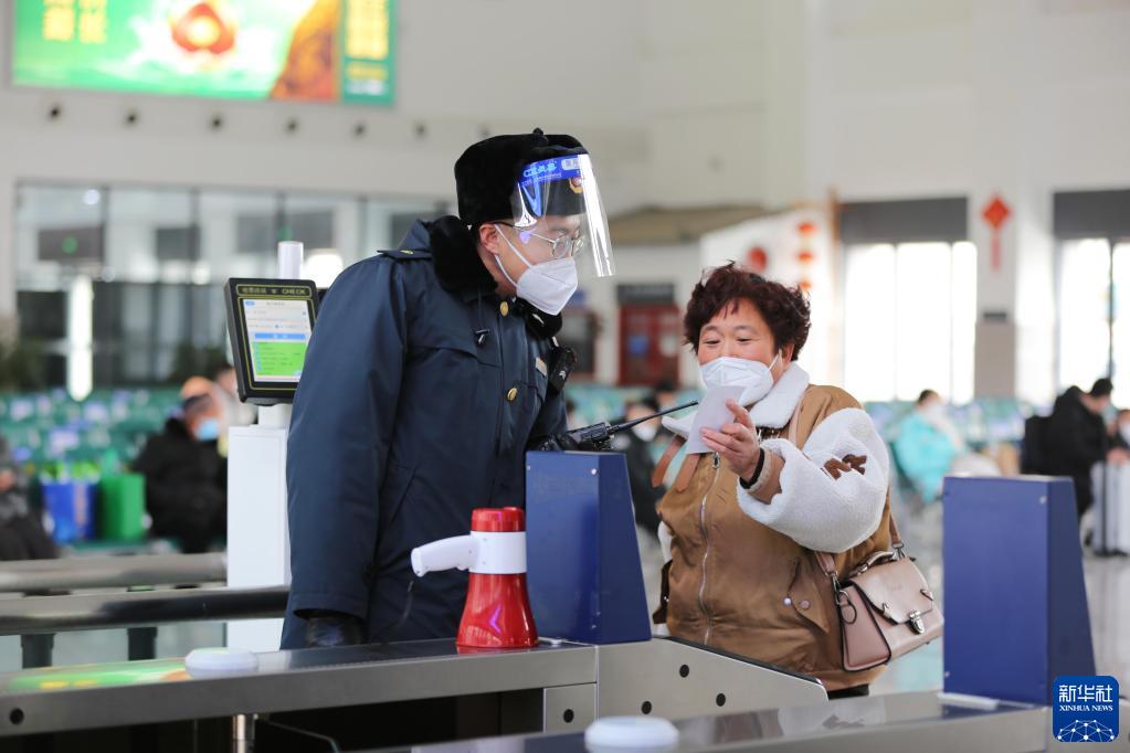1月1日,寶蘭高鐵甘肅定西北站的工作人員在引導旅客檢票。