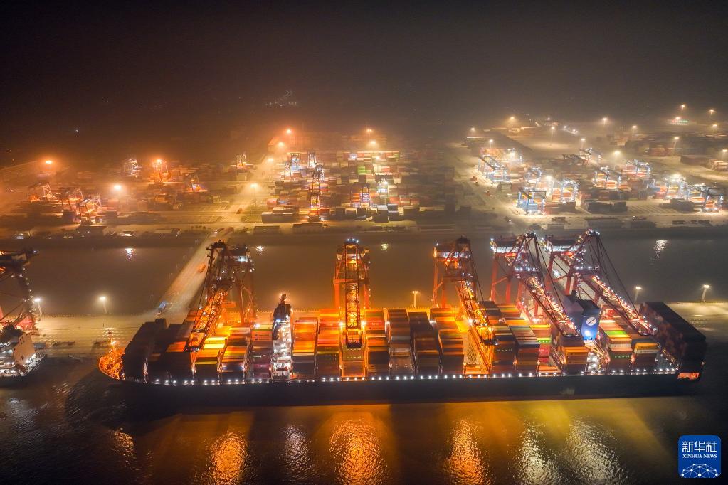 1月1日,集裝箱輪在寧波舟山港金塘港區大浦口集裝箱碼頭進(jìn)行裝卸作業(yè)(無(wú)人機照片)。