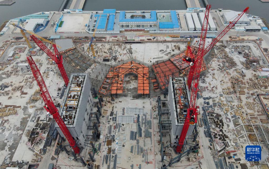 1月1日,工人在位于中國(上海)自由貿易試驗區臨港新片區的中建二局臨港西島中銀金融中心項目工地上忙碌(無(wú)人機照片)。