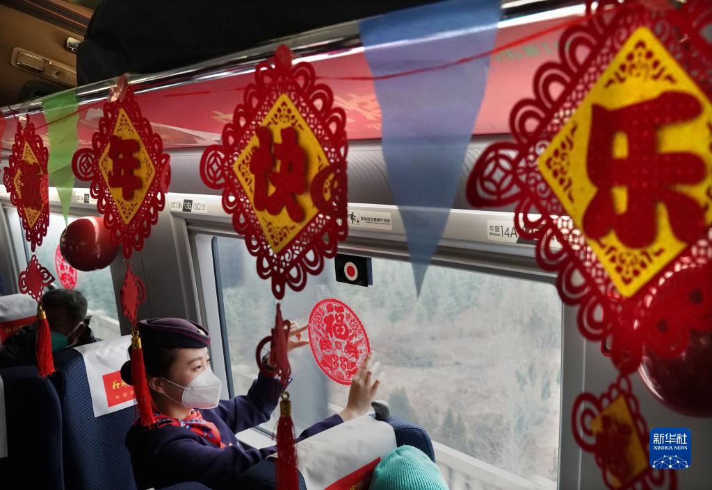 在2023年元旦到來(lái)之際,列車(chē)工作人員將車(chē)廂布置一新,舉行了“你好2023,相約2023”賀新年活動(dòng),為旅客獻上歡快的演出,送上新年的祝福。
